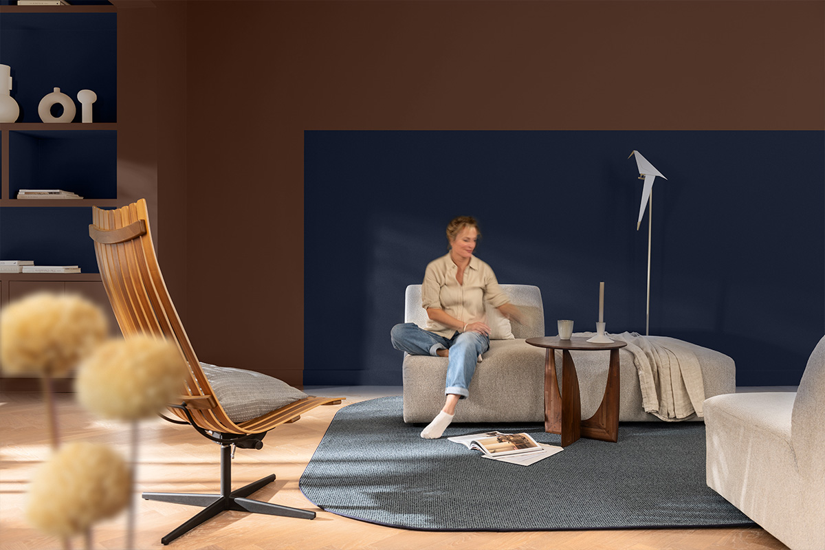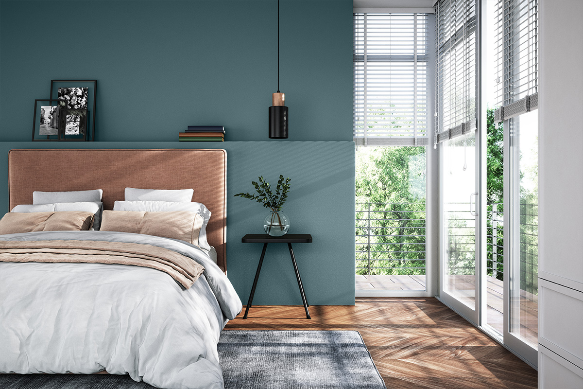 Foto: een blauwe muur met de Flexa Kleur van het Jaar 2026 Slow Swing. Bron: Flexa.