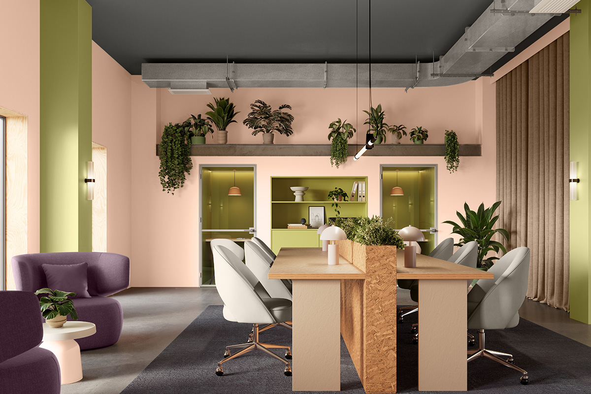 Foto: zowel de muur als de trap in de Sigma Kleur van het Jaar 2026 (Secret Safari) laat de trap wegvallen voor een ruimtelijk effect. Bron: Sigma.