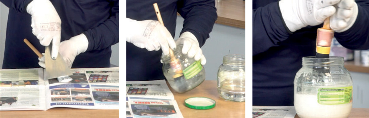 Terpentine kwast schoonmaken (afbeelding 1): strijk overtollige verf af aan het blik/plamuurmes en zet de kwast in terpentine om los te weken. Draai hem daarna rond in een pot met kwastenreiniger om alle verf eruit te halen. Laat 'm daarna tussen je handen rondtollen in de pot, zodat spetters eruit vliegen. Je kunt overtollige terpentine en kwastenreiniger ook afdeppen in een oude doek of buiten uitslaan oven een krant.